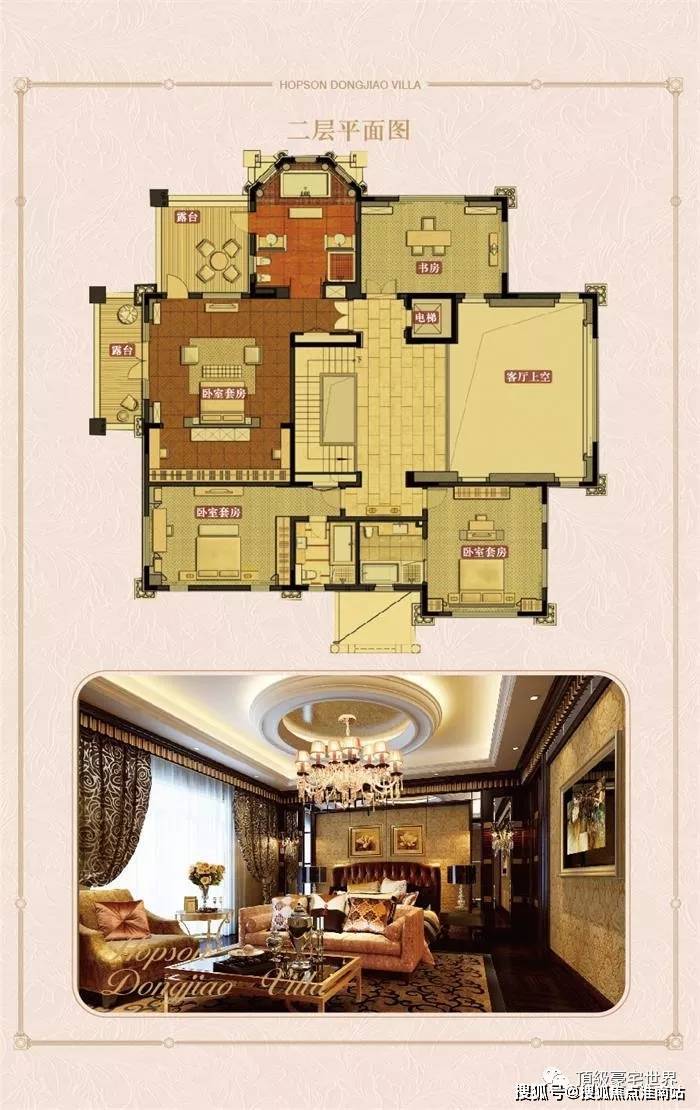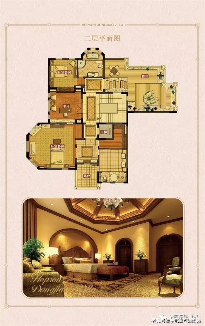 二楼,是主人居住区域,层高3.4米起(部分穹顶位置层高较高),共设计有三间套房,一间书房,二个大露台。