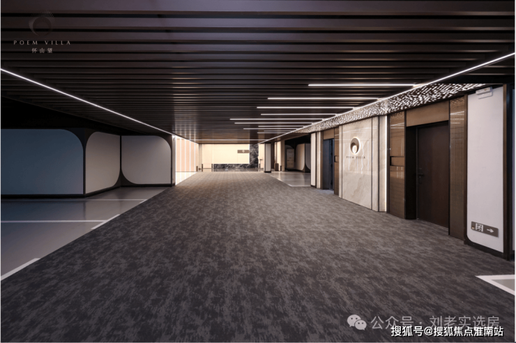 叠墅入口光厅墙面运用金属饰面与仿石岩板,金属的精致与岩板的质感相得益彰。六叠首层电梯厅天花与地面采用弧形元素;墙面岩板搭配不锈钢线条,增添细节与品质。