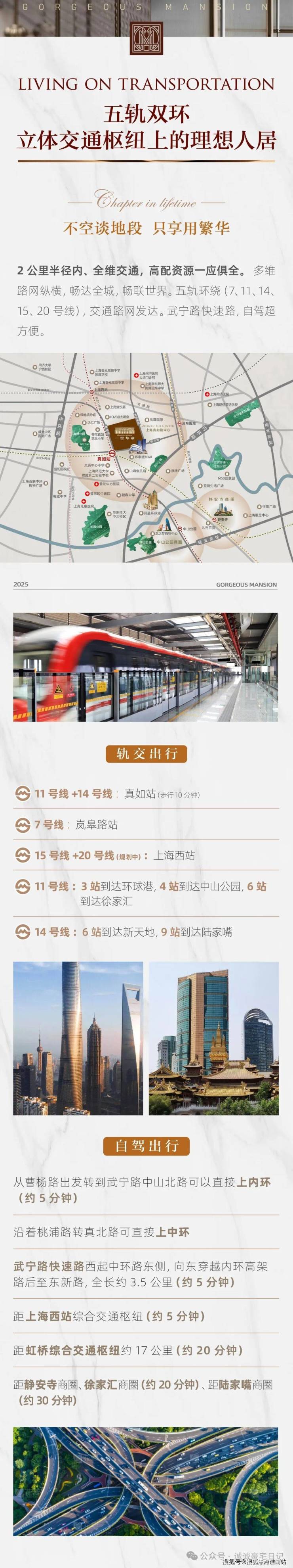 自驾:距武宁路快速路约600米,18分钟直达虹桥枢纽,30分钟覆盖徐家汇、静安寺、人民广场等核心商圈