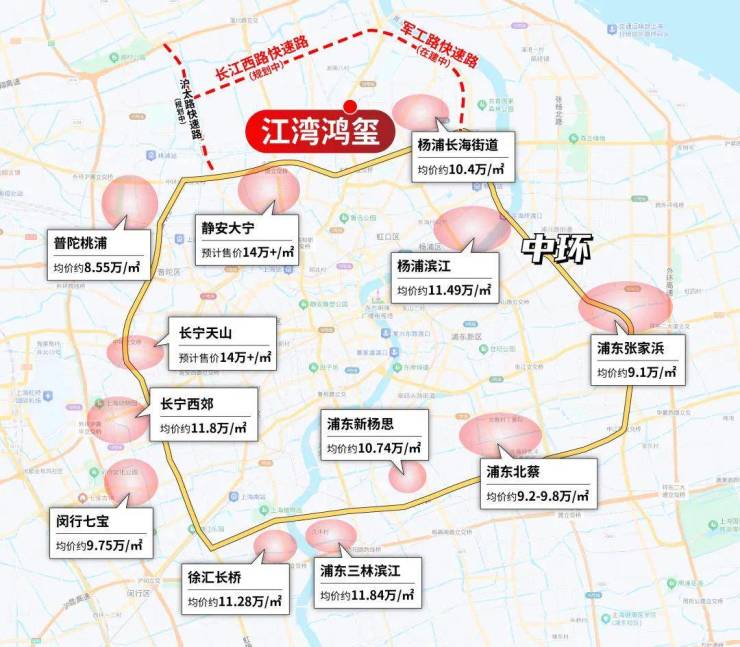 再来看中环沿线新房价格当前的格局。规划强势的如徐汇长桥,三林滨江,静安大宁,杨浦滨江等,价格全面突破11万+/㎡。