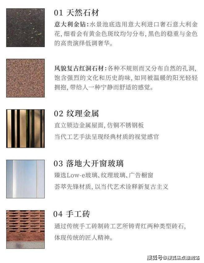 项目采用天然石材和现代工艺相结合的手法,水景池底则选用意大利进口奢石金钻,大门选用风貌复古红洞石材。