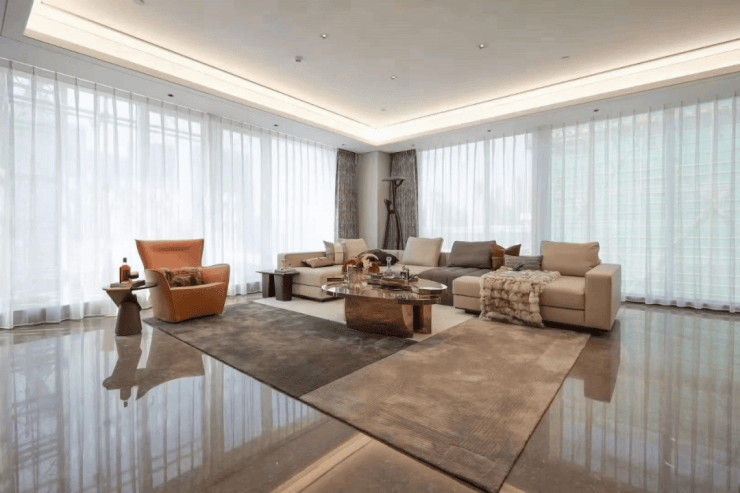 产品与户型:主力户型为建面约330-460㎡的大平层,采用“三梯两户”设计,层高达到3.8米,得房率高达86%。外立面由日清设计操刀,采用大面积玻璃、铝板与石材结合,并配备约2.6×2.4米的巨幅落地窗和约12㎡的阔景阳台。