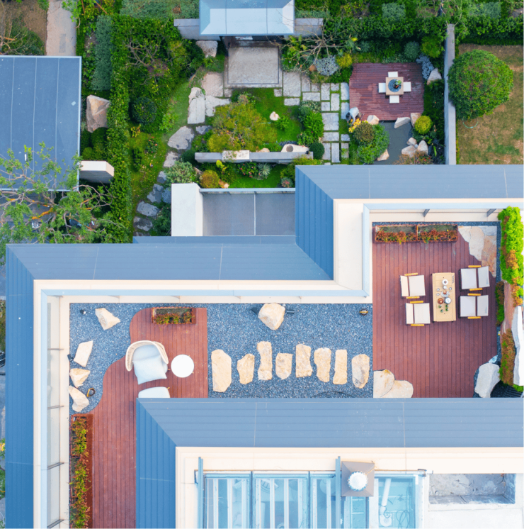 这个露台做了私梯,可以从北面的入户庭院直达,也是很方便。除了房间,多出来的空间,适合做星空花园,烧烤、影院、聚餐非常合适。