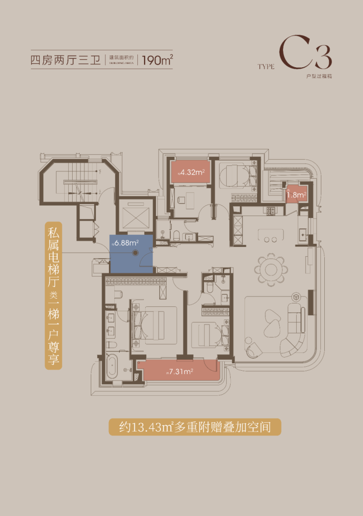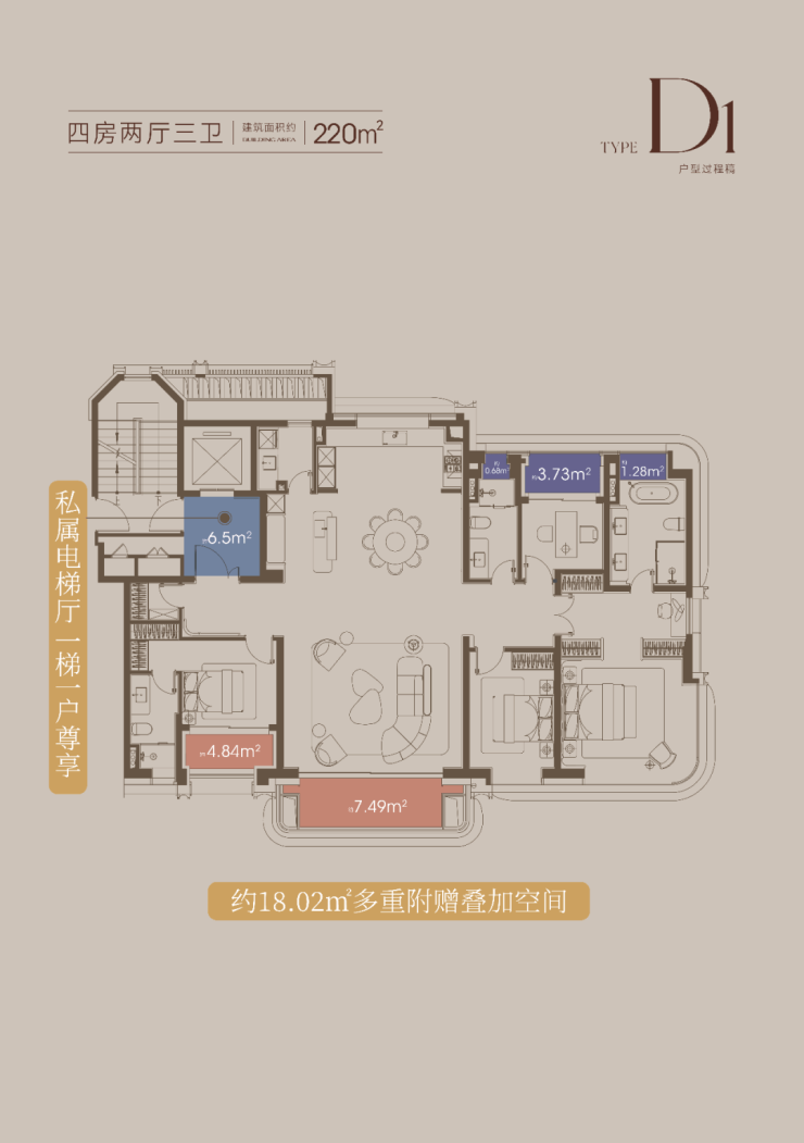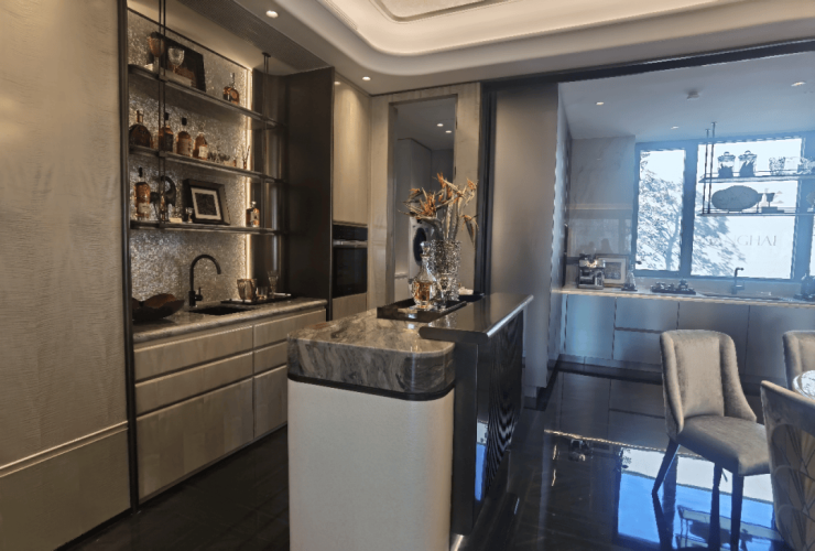 本次加推的焦点,无疑是位于社区楼王位置的 建面 约220㎡四房两厅三卫 户型 。它由知名设计公司SLD梁志天打造,以 “西意東韵·奢享鎏金” 为理念,堪称终极改善的终极答案。