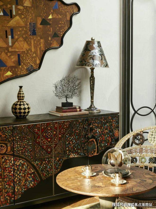 玄关柜选用的是曾经上过佳士得拍卖行的同系列柜体、柜体的材质运用泰国进口稀有珍珠鱼皮密拼,将稀有材料与传统技艺相结合,每条鱼只有鱼背中心一块可以使用,处理后的鱼皮手感特别。