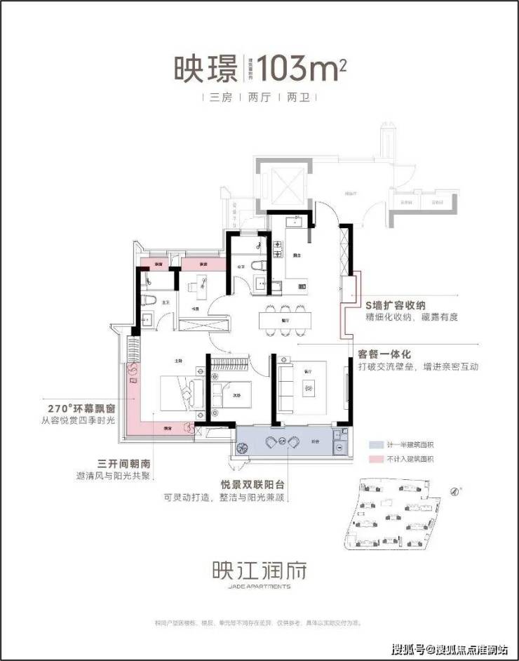 空间设计优越:103㎡户型4开间朝南+6米大横厅+270°环幕飘窗,江景视野最大化,空间利用率高。