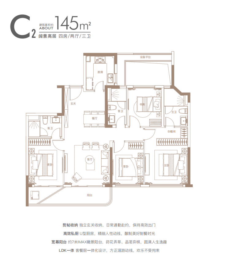 独立玄关、U型厨房、主卧大套间、三开间朝南大面宽等均为标配,堪称140㎡段的“完美四房”。