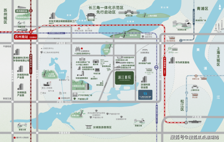 4轨交汇:沪苏湖高铁(计划2024年通车)、通苏嘉甬高铁(计划2024年苏州段通车)、沪苏嘉城际铁路(计划2028年通车)、轨交17号线西延线(建设中)。