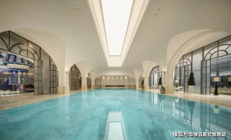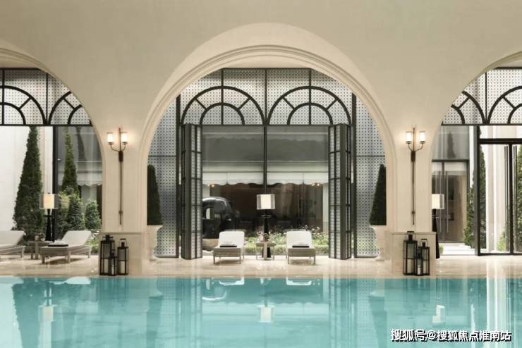 地下恒温泳池三面采光,顶部是15米玻璃天顶倒映着空中花园水景,泳池底部300万片马赛克拼出名画《睡莲》局部。两侧黑色铁艺屏风外是下沉庭院,让业主在游泳的同时也可看到外部的自然景观。