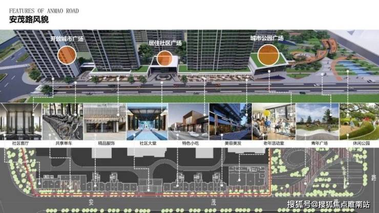 以"城市针灸"理念重塑安茂路街道基因,打造全时态商业配套界面,通过3组口袋广场与建筑内退策略的耦合设计,打造"15分钟活力磁场",激活街道活力。