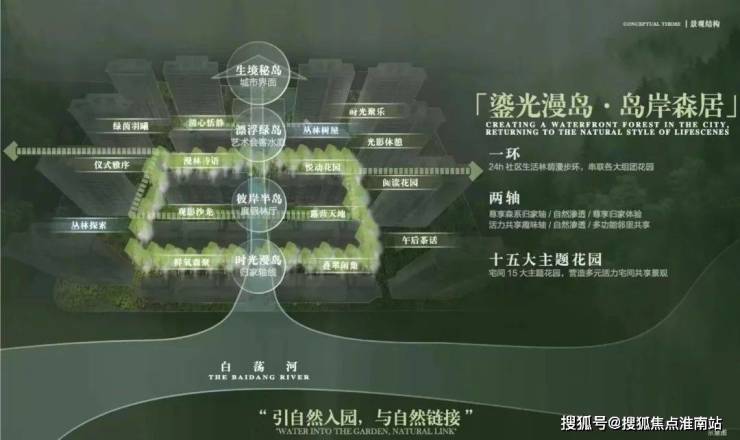 以“山水聚场”理念,规划“一环两轴十五园”景观布局,将水岸、岛屿、森林、花园、树屋作为园林节点,形成“行在景中、坐在岛中、游在林中、意在境中”的美学表达,营造出沉浸式山水活力场域。