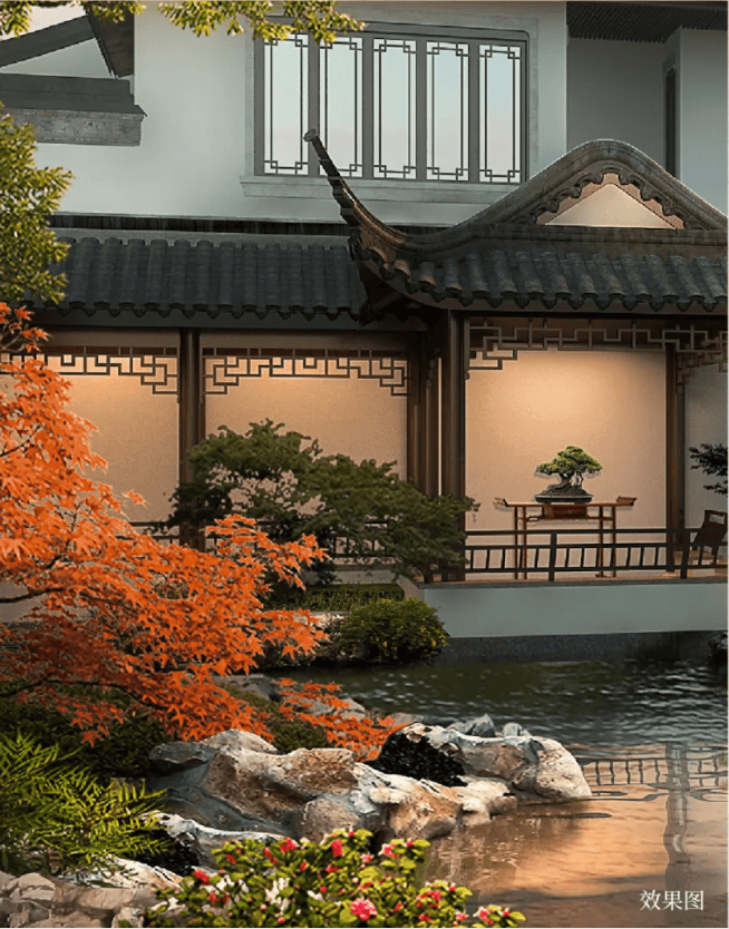 大宅后花园,采用了围合式的建筑结构,有泗水连廊、有金鱼戏水,彰显中式大宅的典雅大气。