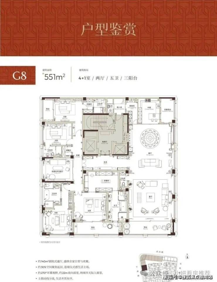 以约160㎡单层空间承载家庭生活的仪式感,约60㎡客餐厅贯通休闲阳台,空间通透、气度非凡.全套房设计,保证每位居者的私密与舒适,礼序有致、功能齐备.