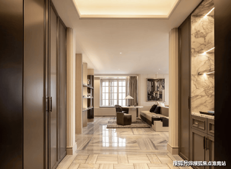 进入室内的入户玄关收纳空间,地面采用静雅棕、宝格丽兰石材拼花设计,古典回形波打+实心铜条的搭配增强入户尊贵感。右侧是山水白奢石的开放格,左侧是行李间,通过暗门的做法,将功能结合进去,强化了归家的仪式感。
