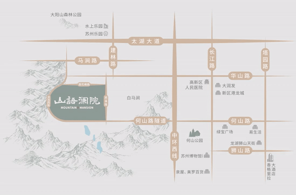 项目所处板块在地理位置上处于高新区中心位置,东有狮山核心CBD西有科技城,共享两个区域优质配套。以周边山水自然风光为基础,何山隧道为纽带,连通进一步项目与狮山片区。实现自然风光 — 项目 — 都市生活链条,构建多元生活场景。