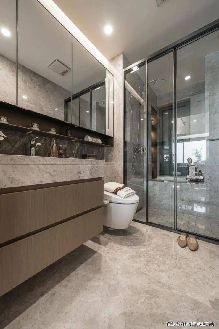 卫浴空间同样精彩,采用高仪的台盆、龙头、智能马桶、淋浴花洒等,主卫创新定制“美妆冰箱”,满足业主对美妆、护肤用品冷藏的需求,足见开发商对成本的舍得。