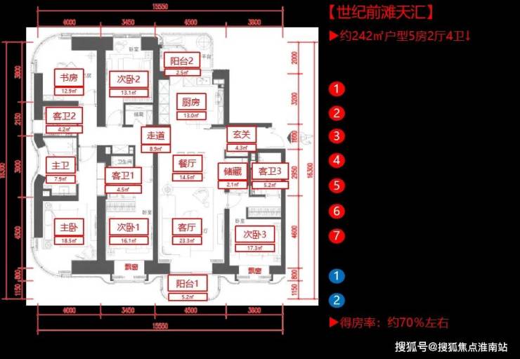 242㎡一共2套,分别位于1#和2#的5楼,全部5房4卫,功能性很强,但采光有影响;