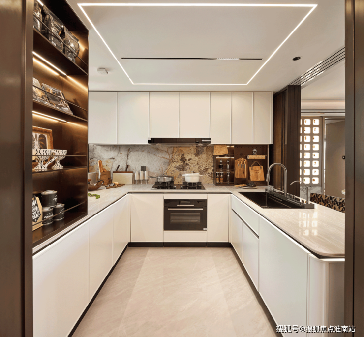 b.U 型厨房更创新采用上海首个高低台设计,既解决下厨弯腰痛点,三面台均分还能拓展操作空间。