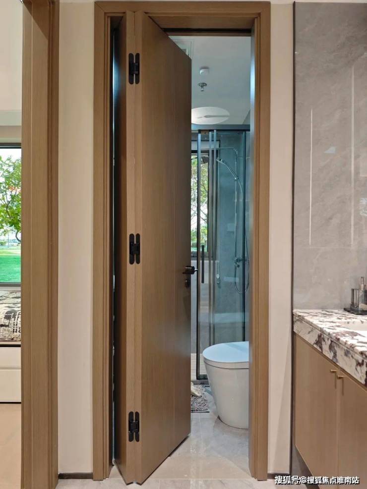 这次沁香园在所有户型的卫生间上都做了一些「折叠」的设计.比如卫生间的门是双折的,淋浴间移门是三移门: