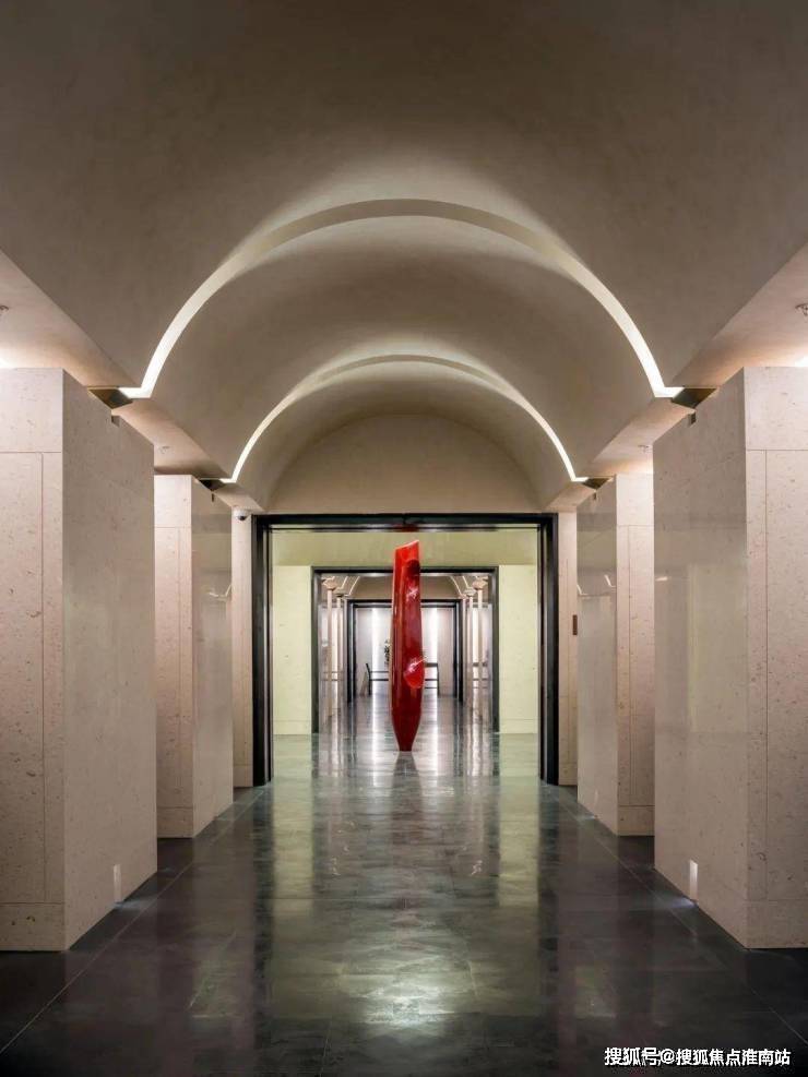 二楼的接待大厅,一尊拔地而起的红色雕塑,其顶部向上挑空到了三层。整个厅堂,都将不定期的进行展品更新,艺术气息浓郁。