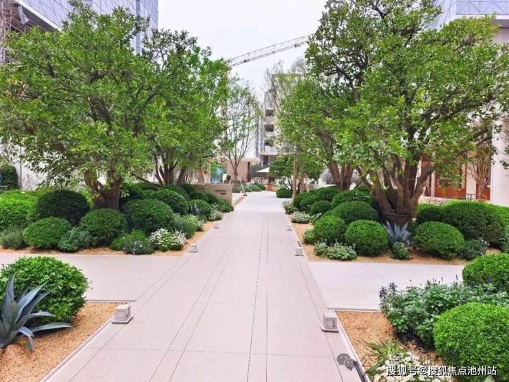 20 余棵千年油橄榄树,搭配莱姆石铺装、冰川蓝水景与沙生植物,构建出沉浸式度假氛围。结合约 9 米天然高差打造的立体抬板社区,让蓝调泳池、立体叠瀑水景与层次丰富的绿植错落交织,营造出移步换景的空间体验。