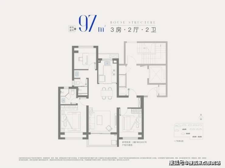 建面约97㎡3房2卫,升级版大3房,入户玄关+主卧套房设计,整体私密性更强,空间更为宽敞.