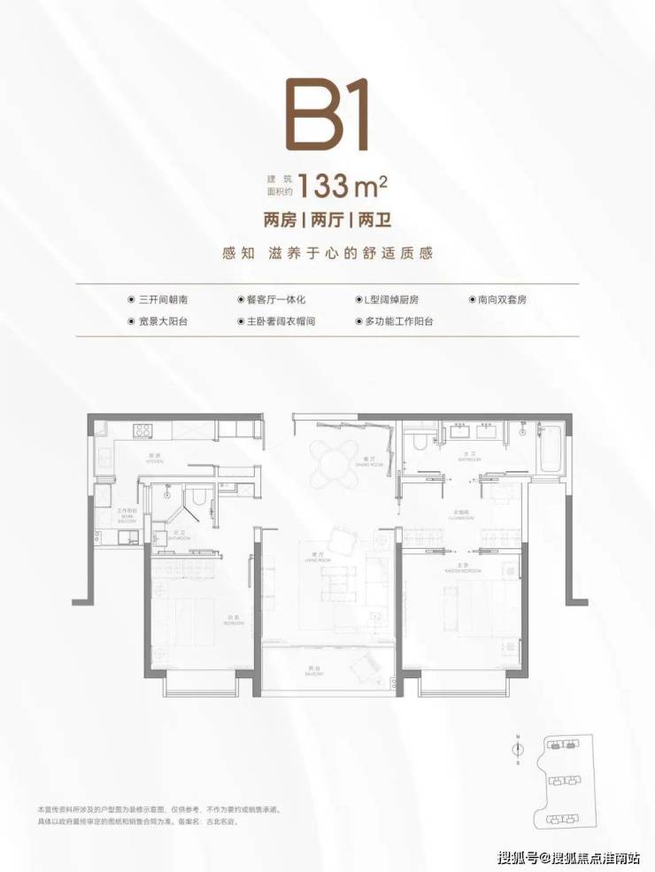 值得一提,该户型餐厨空间可塑性很强,3房可成长“3+1”房,用作工作间、琴房等,改善一步到位,比固定不变的4房更灵活。