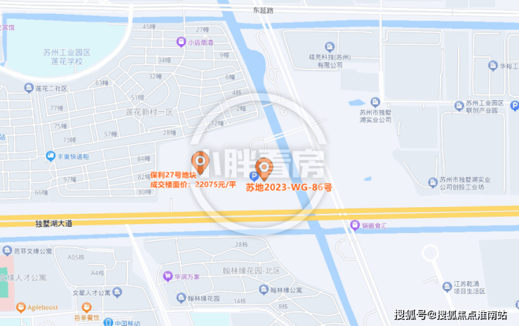 北面是住宅小区莲花新村,东面河流,南面是独墅湖大道,隔河就是住宅小区翰林缘,西面则是在建的保利珺华赋。