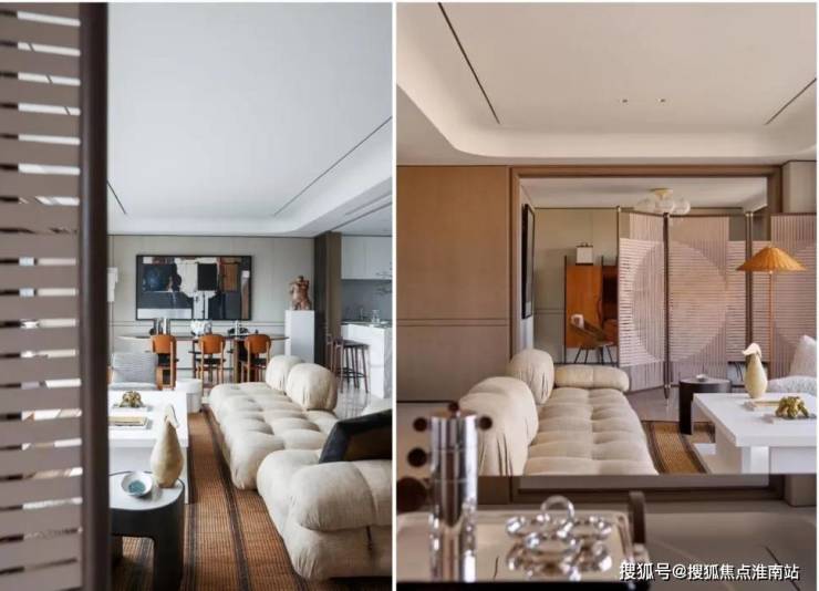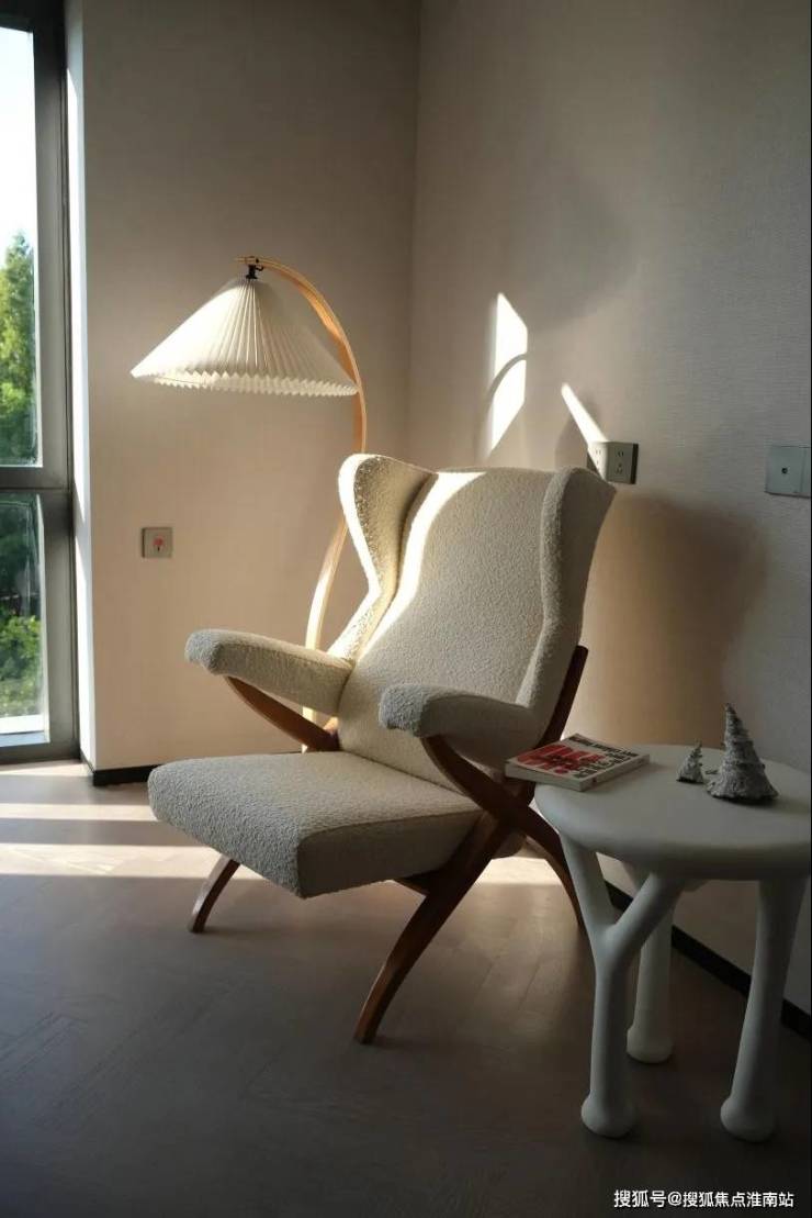 样板间的设计本身就是「静谧与光辉」的具象:约8.8米江景会客厅的窗前,黄浦江景如一幅流动画卷,成为展览最天然的“动态展品”;室内以米白、暖棕为主调,搭配原木纹理的家居艺术品,营造出「静谧」底色;而设计师精心布置的灯具,在夜晚与窗外霓虹、粼粼波光相呼应,形成「光辉」的对话。