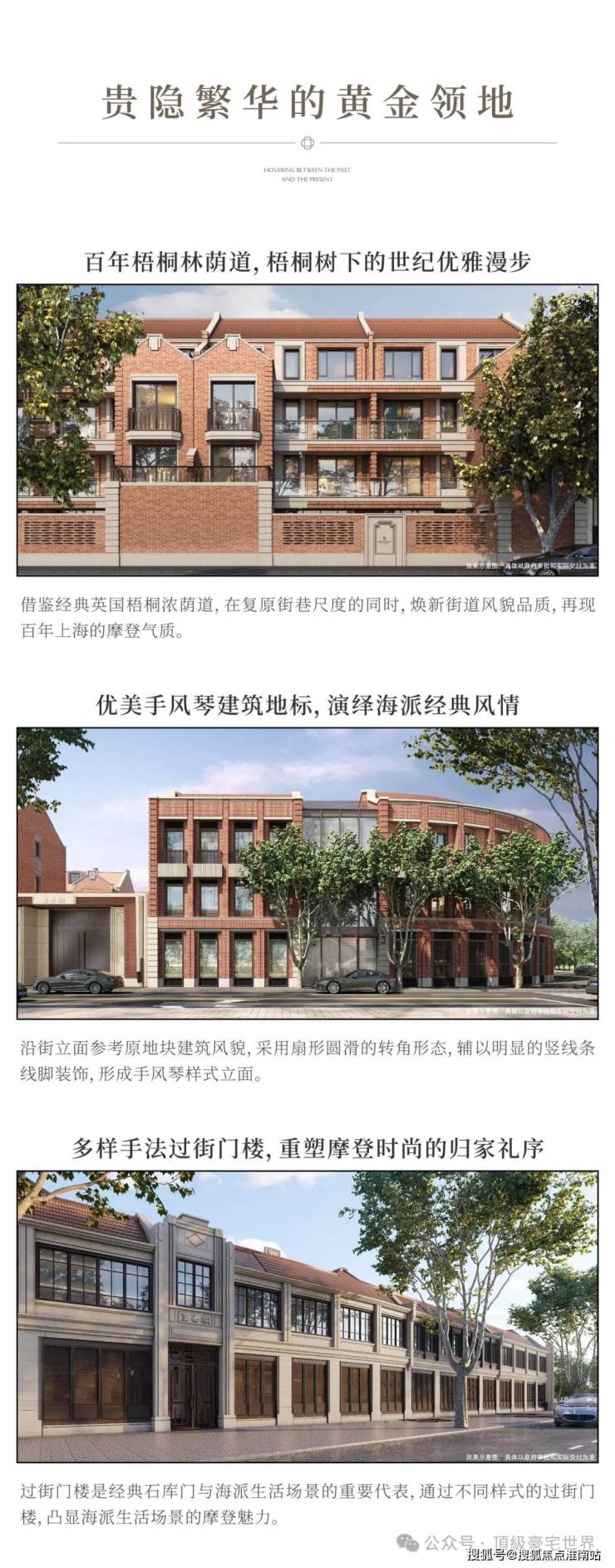 ②新复古元素深入看细节,你会发现项目高颜值的6大新复古元素。包括Artdeco复古式窗套、现代石材抹角、典雅山花样式、墀头屋檐一体化设计、经典仿木百叶、石库门专属地砖符号等,用先锋表达回应在地文化。