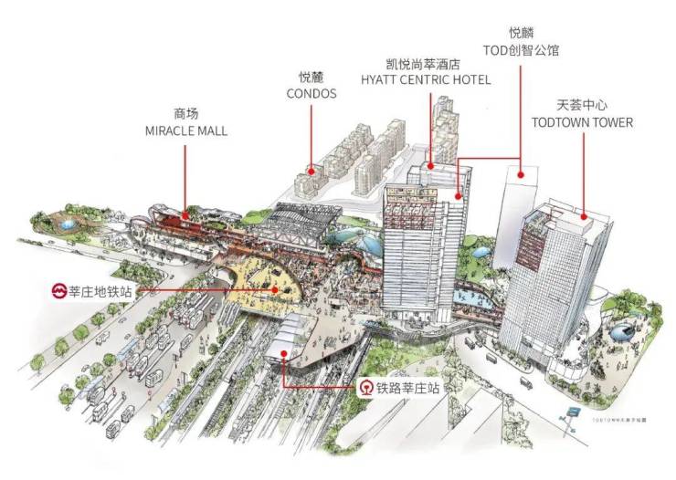 TODTOWN天荟又称莘庄地铁站上盖综合开发项目,项目采用TOD(Transit-Oriented Development)即公共交通导向型发展模式,以公共交通为导向、以交通换乘站及大型商业为中心,以5—10分钟步行时间为半径,建造出地上、地下共计70万平方米,集住宅、商场、酒店、创意办公、写字楼、交通枢纽、公共艺术空间等为一体的新一代枢纽综合体。