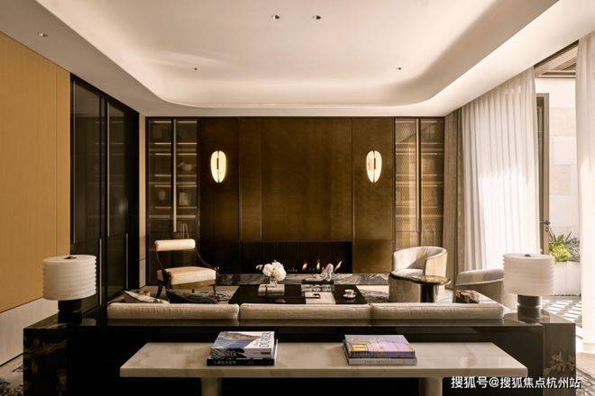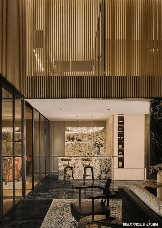 透过瀑布湍流的天光庭院,你在泳池里就可以看到会客厅中家人相伴的身影。会客厅沙发背后的镂空转角奢石景墙与金属屏风,不只是装饰品,它让会客厅与背后奢华的大堂吧隔而不离。你可以透过它,看到吧台的透光奢石景墙。