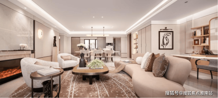 全屋悬浮式吊顶设计,取代了已经泛滥的弧面吊顶造型,搭配无主灯设计也很好看: