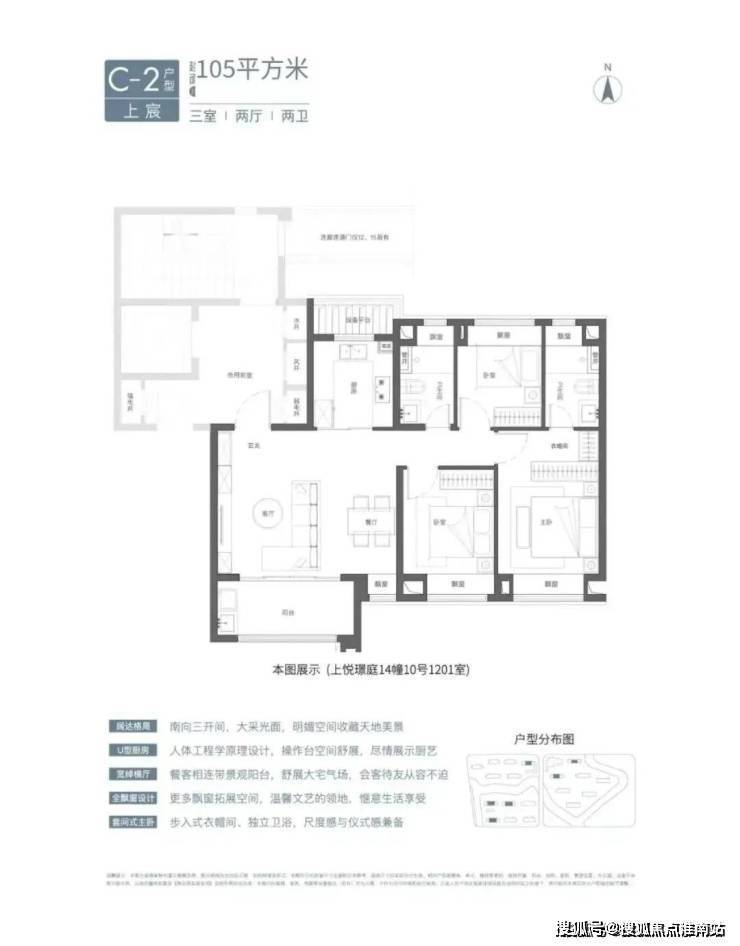 建面约105㎡3房2卫有宽厅和竖厅两种风格,其中宽厅户型好评度颇高。