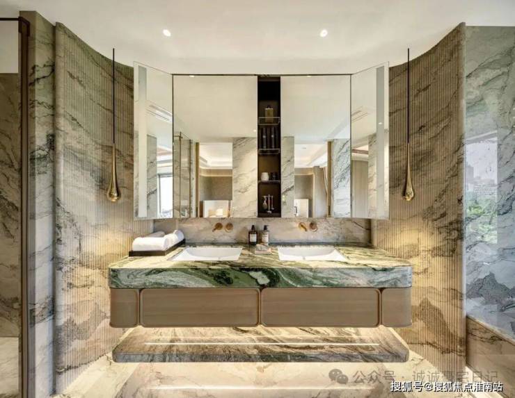 万科中興傲舍凝聚72种高端豪宅都难得一见的奢材,如皇家白奢石、Prada绿皮革面奢石、砖纹定制铝板等等,每一处细节都透露出精致与考究。