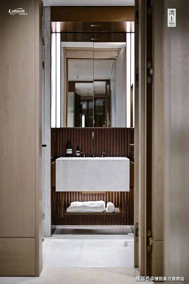 湾上采用地上+地下三层同标准精装入户大堂,大堂选用有着媲美艺术品表现力的亚马逊绿天然奢石,而且地上地下一脉相承、华贵一致,结合仿古铜不锈钢、艺术壁灯为点缀,将上海的摩登气息注入归家大堂,给业主更强烈的入户仪式感。