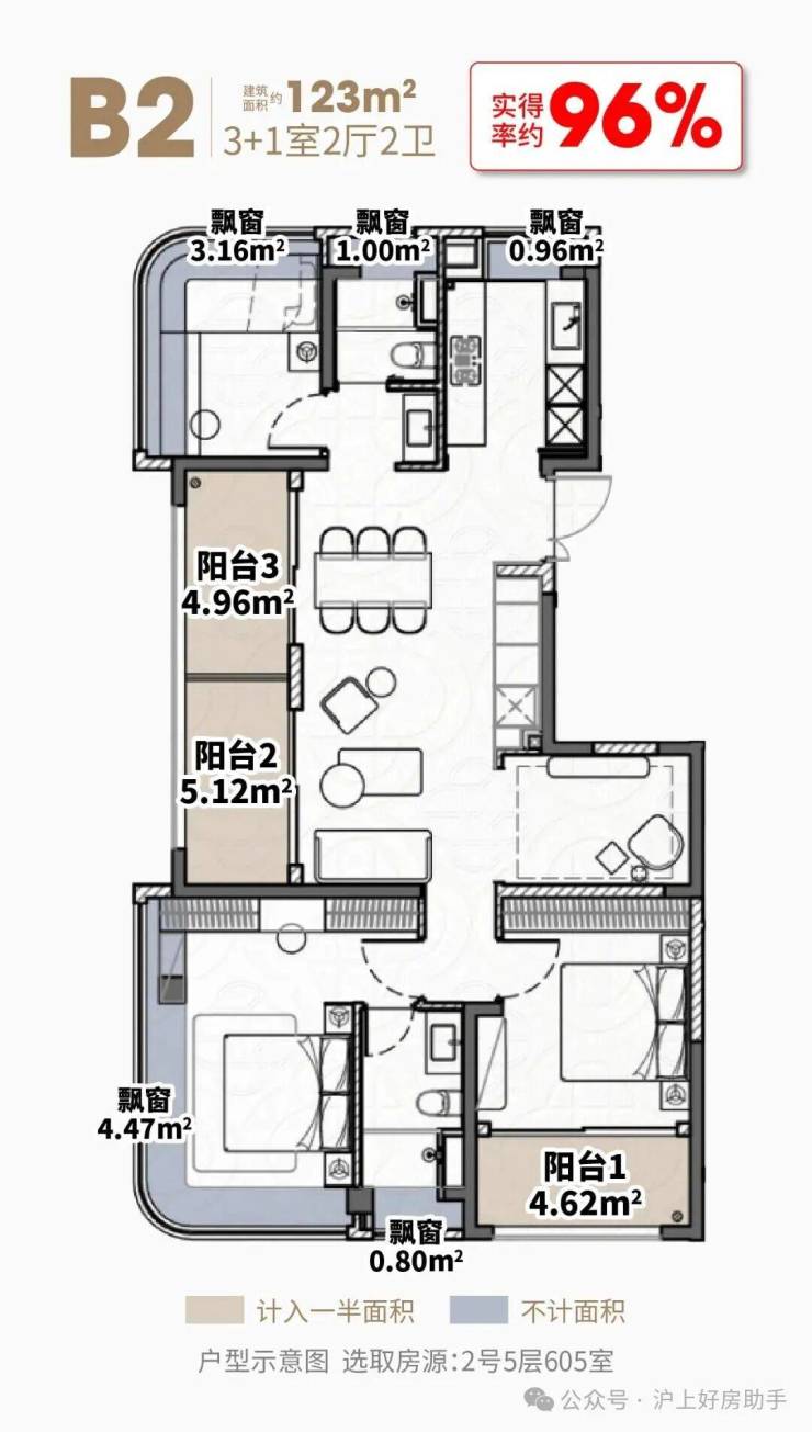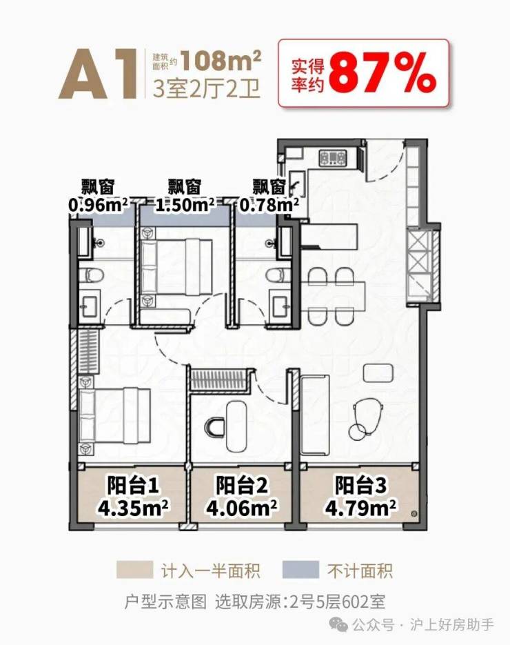 阳台+飘窗算下来,约108㎡户型的实得率达到了惊人的约87%,实得面积约94㎡!