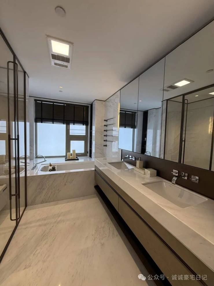 厨卫方面,西厨定制高柜,容纳嘉格纳蒸烤一体机、嘉格纳双开门冰箱、洗手台以及各类收纳空间;中厨自带嘉格纳灶具、油烟机和洗碗机。主卫配置劳芬台盆、浴缸和独立卫浴洁具空间、独立淋浴空间配备当代的花洒,顶部有松下暖风机,还配置了电热毛巾架。