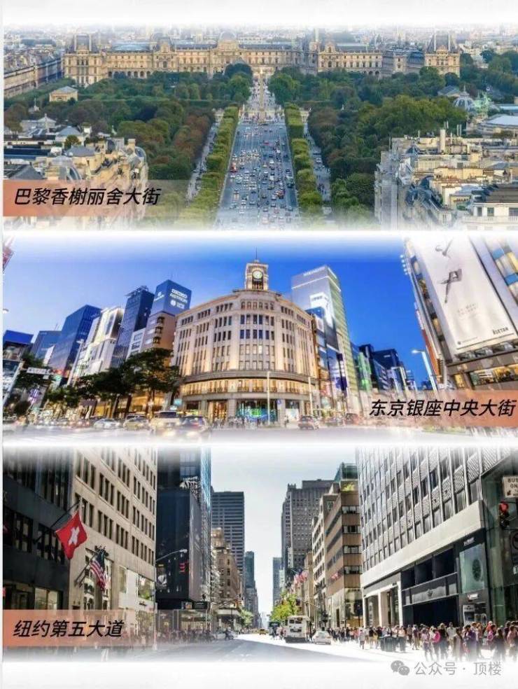 商铺顶级对标:项目对标世界三大商圈,巴黎香榭丽舍大街、东京银座中央大街、纽约第五大道,进行同级别的商业规划及氛围布置。