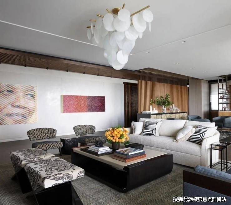 百分之百的优雅对材质的要求异常严格,而胡桃木的材质恰好强调了空间的高级感,利用老式LaVerne茶几、KellyWearstler的椅子和FortStreetStudio的地毯让人仿佛穿越回五十年代的复古时空.