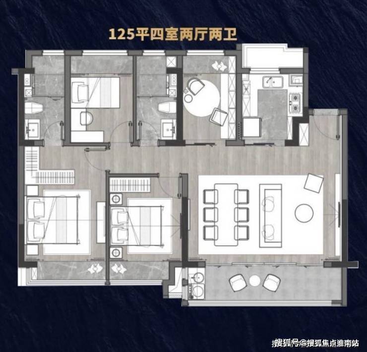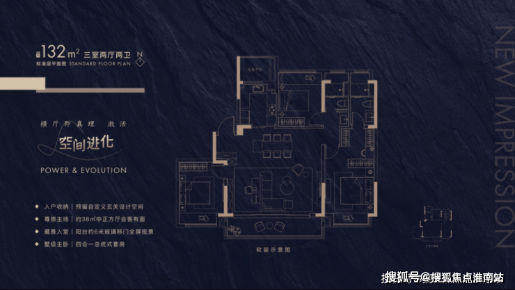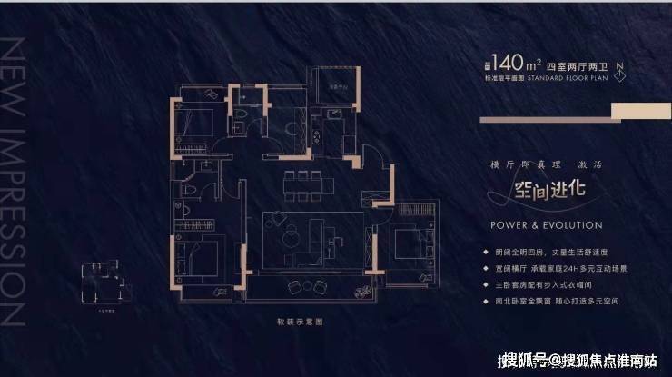 设计:大横厅(最大7.2米开间)、270°飘窗、双明卫,105㎡户型得房率高