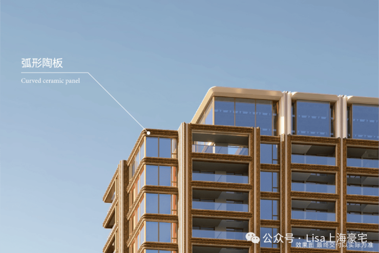 建筑四面均采用铝板+玻璃+定制陶艺,历经百次试烧锻造鎏金陶板,成就上海唯一国际东方艺术全景立面,每面皆城市封面,整体采用非对称的结构设计,回应上海东西方文化交融碰撞的城市美学。大胆采用四排楼布局,以保证户户通风采光,类一梯一户无连廊设计,将入户私密性做到极致。