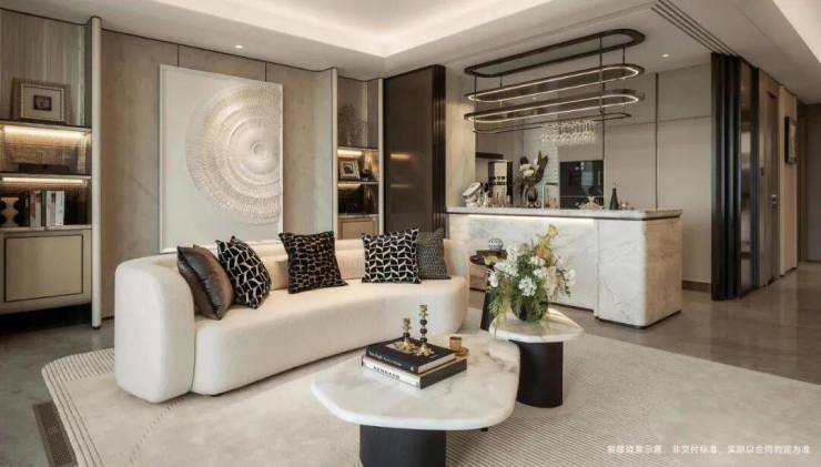 客厅背景墙的“烟雨江南”天然大理石,不同于传统平面背景墙,通过弧度及立体的造型处理,并镶嵌不锈钢材质,对于金茂而言,比奢石昂贵的,是让奢石真正与空间气场融为一体。