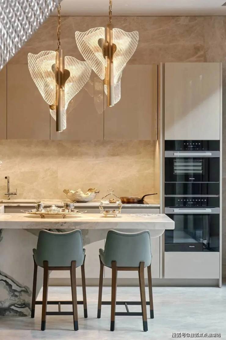主厅核心区悬浮式定制柜体,银箔与丝绸在几何切割中构建中式基因,毕加索石材的天然裂变肌理成为天然艺术装置。瀑布吊灯以流体力学演绎东方留白,让光影在岩板表面生长出动态水墨意境。