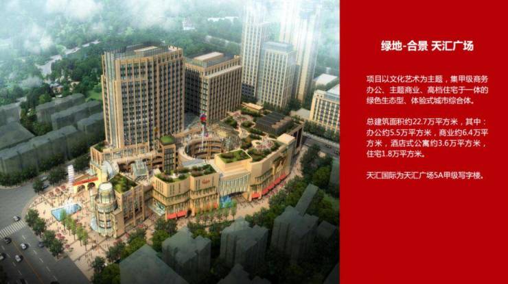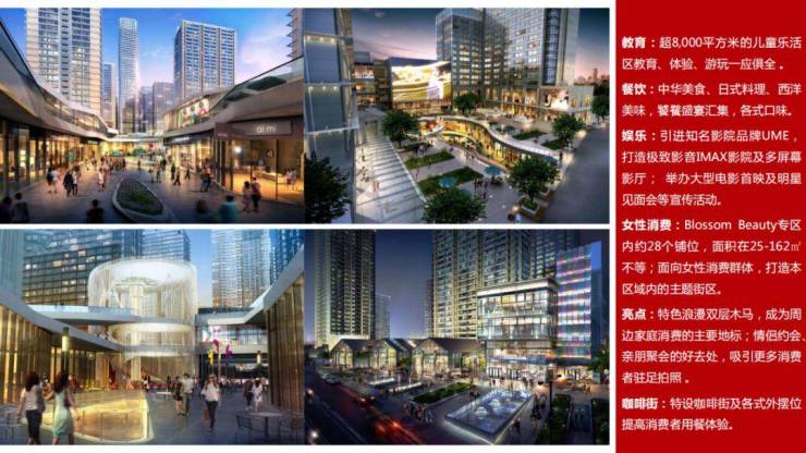 项目集逾14万方高端住宅、约22万方旗舰商场、2幢精品酒店及4幢办公写字楼于一体,建成地标性的高尚消费圈。同时设有名店区及多个表演场地,构建购物消闲圈、时尚优活圈、经济核心圈、创意文化艺术圈四大尊尚领域。