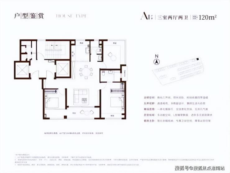 建面约120㎡三房,类一梯一户,户型方正,三开间朝南+南北通透、双联瞰景阳台+主卧飘窗+北卧L型转角飘窗的设计,完全击中了年轻人的“心头好”。
