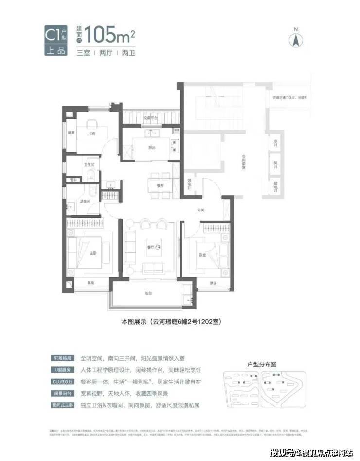 建面约105㎡3房2卫有宽厅和竖厅两种风格,其中宽厅户型好评度颇高。