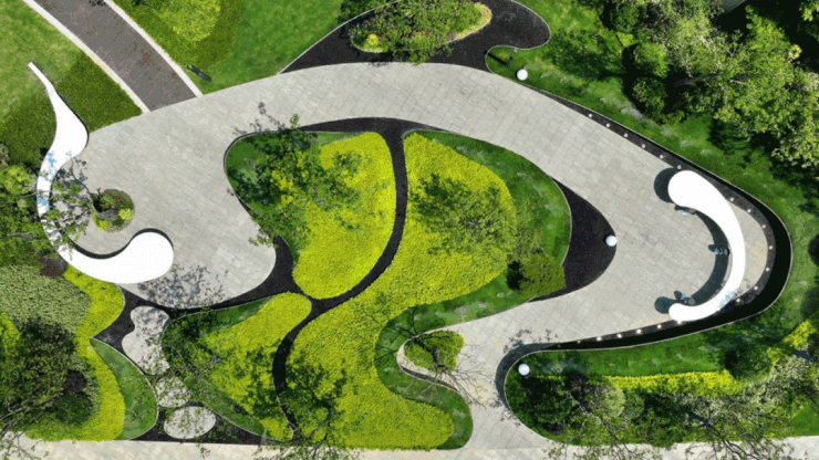 园区景致,从曲径通幽处起始,穿过月洞门,将外界的喧嚣经由林荫小径,变换为静谧的归家心境。复行数十步,会听到水声流鸣仿若弯月的一池水景映入眼帘,潋滟的波光倒映着一畔的景亭,传统文人笔下的雅集之趣与山水气韵悠然而至。