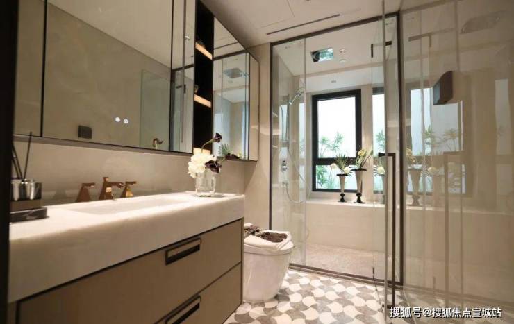 来到建面约112㎡3房2厅2卫样板房,设计主打海派风格,开放式厨房和西餐岛台,卫生间地面拼花,石材台面镀金龙头。标准的三开间户型,设计上将传统的过道改为餐厅空间,将公共区域做大了。