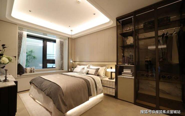 再来看看134㎡3室2厅2卫样板房。比起112㎡户型,这个客厅要宽敞很多,岛台也可以做成独立样式,摆放6人长桌也绰绰有余。主卧采用270度拐角飘窗设计,采光面拉满。